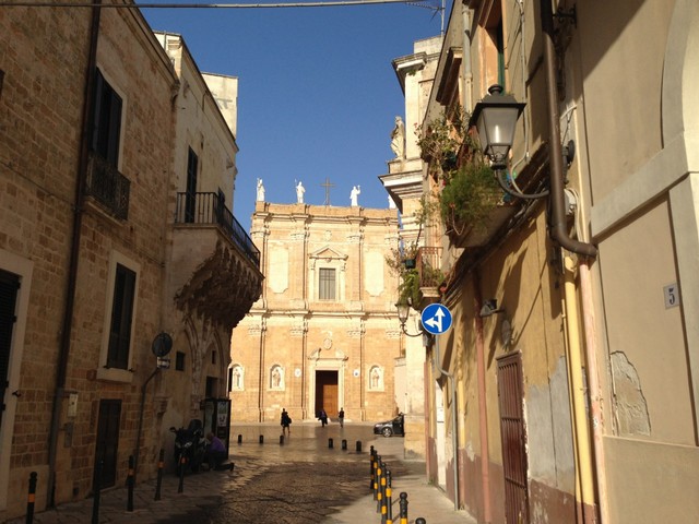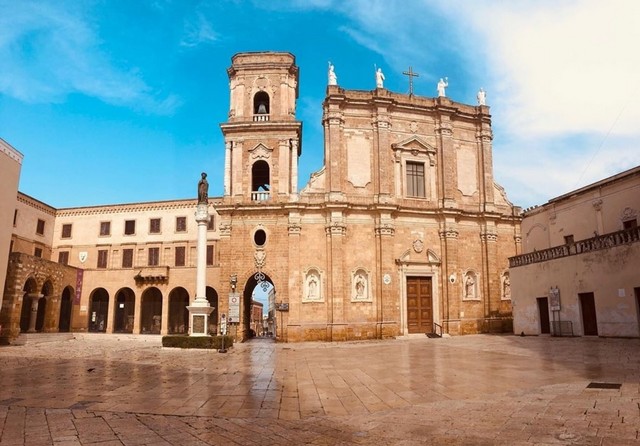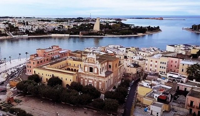 In centro, non distante dalla costa, da visitare è Piazza Duomo con la relativa chiesa settecentesca, la Loggia Balsamo e il Museo Archeologico intitolato a Francesco Ribezzo. Altra importante chiesa è quella di San Giovanni al Sepolcro, costruita attorno all’undicesimo secolo dai Cavalieri Templari e dalla curiosa struttura circolare. Molte comunque sono le chiese degne di nota, tra cui ricordiamo La Chiesa di San Benedetto (X secolo), le chiese barocche di Santa Maria degli Angeli e di Santa Teresa.