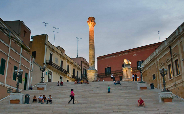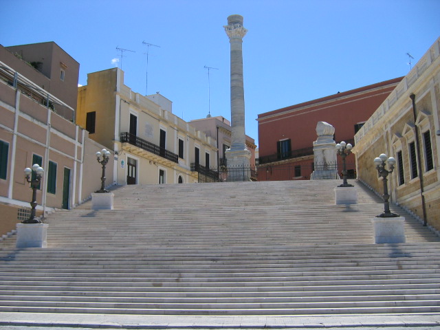 Un notevole luogo dalla valenza storica di Brindisi è quello delle Colonne Romane, punto in cui con due colonne terminava la leggendaria Via Appia che partiva direttamente da Roma. Le colonne rimasero entrambe in piedi fino al 1528, quando una delle due crollò. I pezzi della stessa furono utilizzati cent’anni dopo dai leccesi che li utilizzarono per costruire la colonna di Sant’Oronzo tutt’ora nella piazza principale di Lecce. L’altra colonna, invece, è ancora lì a vegliare su Brindisi, sulla sommità della “scalinata Virgilio” che scende verso il mare.