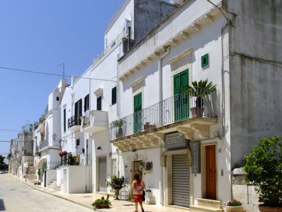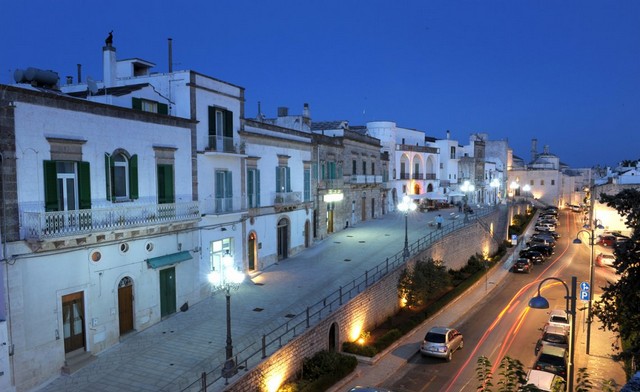 Una esplosione di bianche case che caratterizzano il centro del paese che si trova immerso in una verde campagna ricca di secolari ulivi dove emergono, come trapiantati, i tradizionali trulli mentre in lontananza si può intuire il blu del mare.